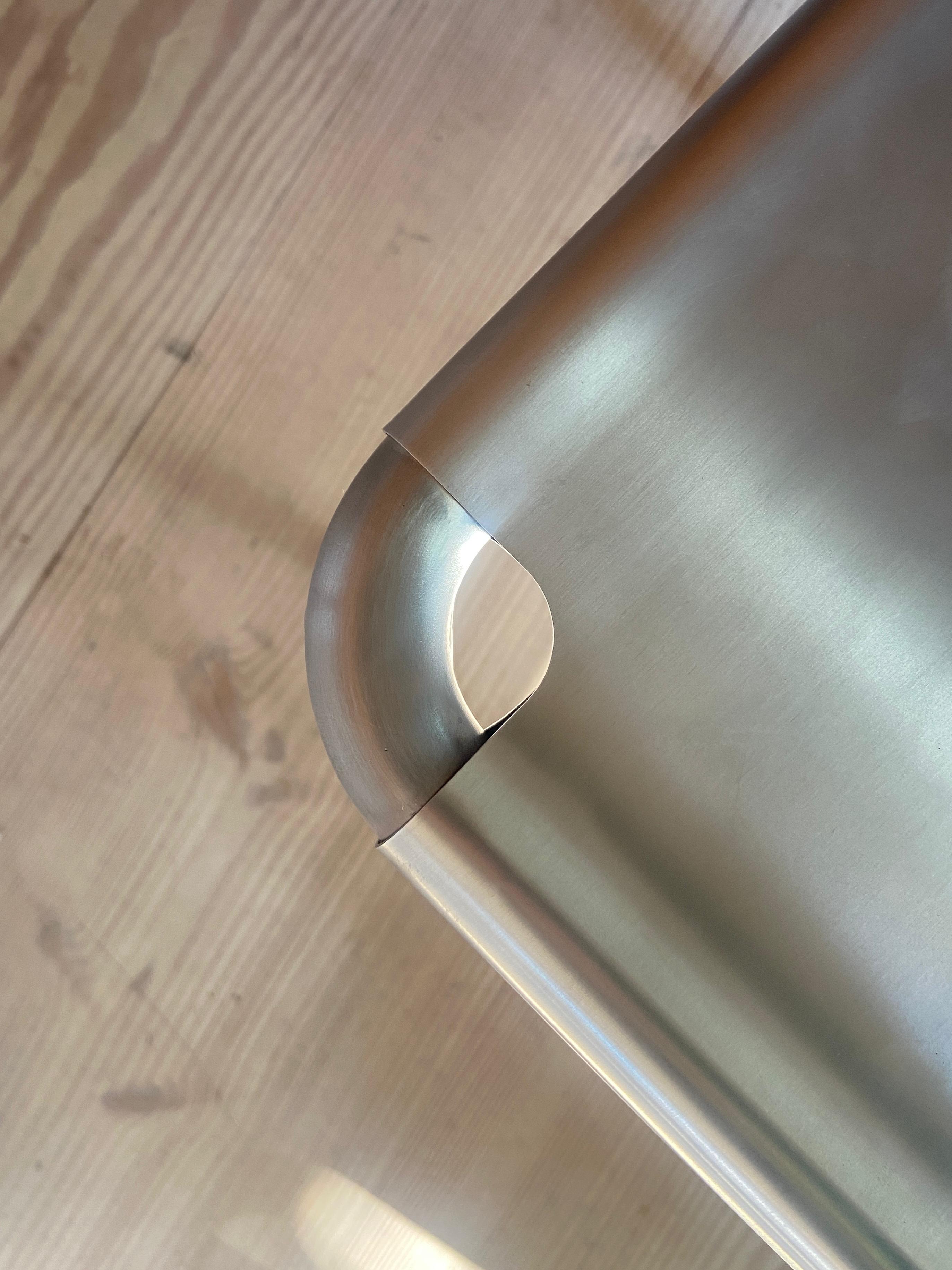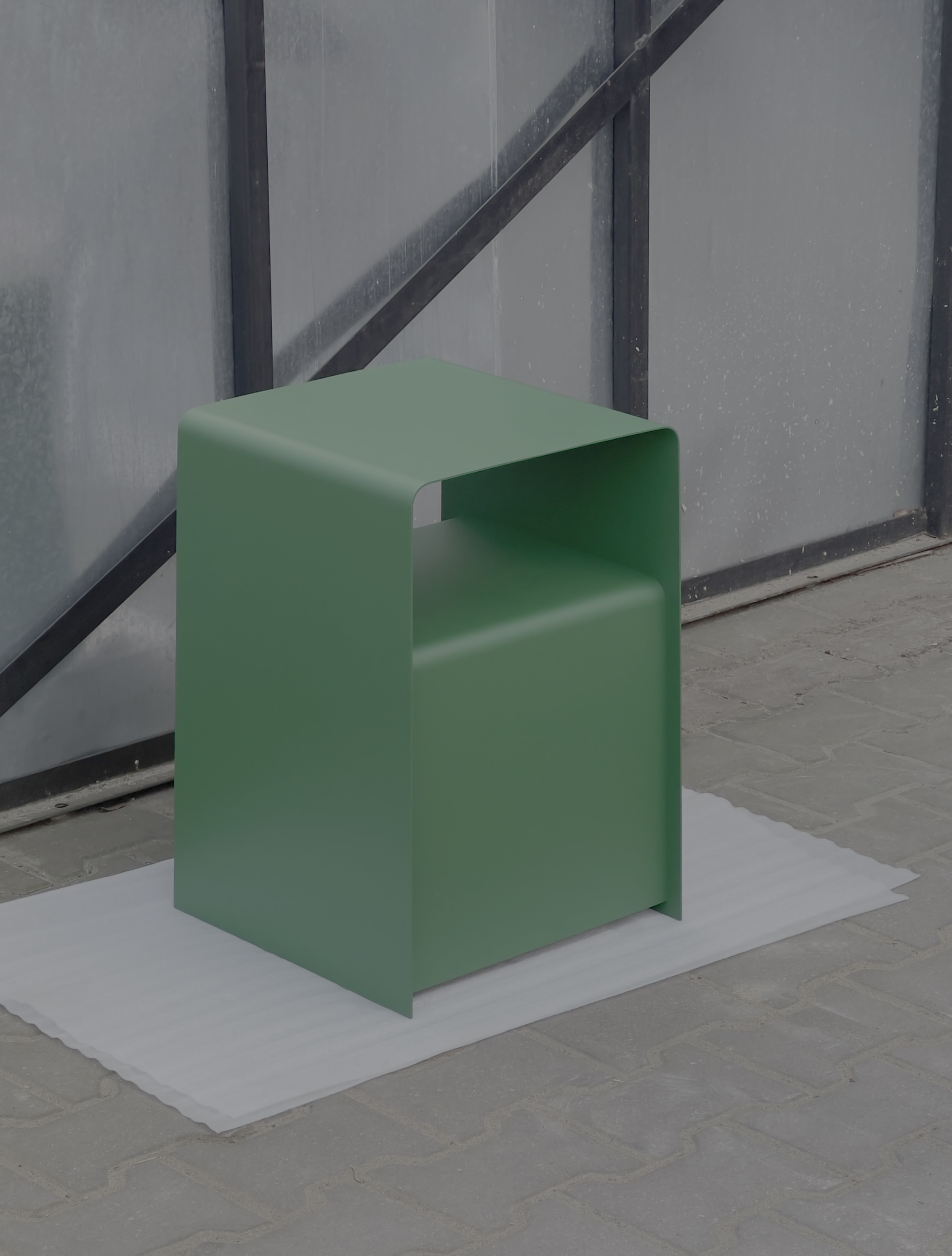 Terra is a collection of superlight aluminium furniture. The sheet components are initially pressed, then folded around the frames, secured mechanically and through use of industrial adhesives. This enveloping method of construction allows the components to be lightweight and use limited material while demonstrating impressive strength and rigidity.